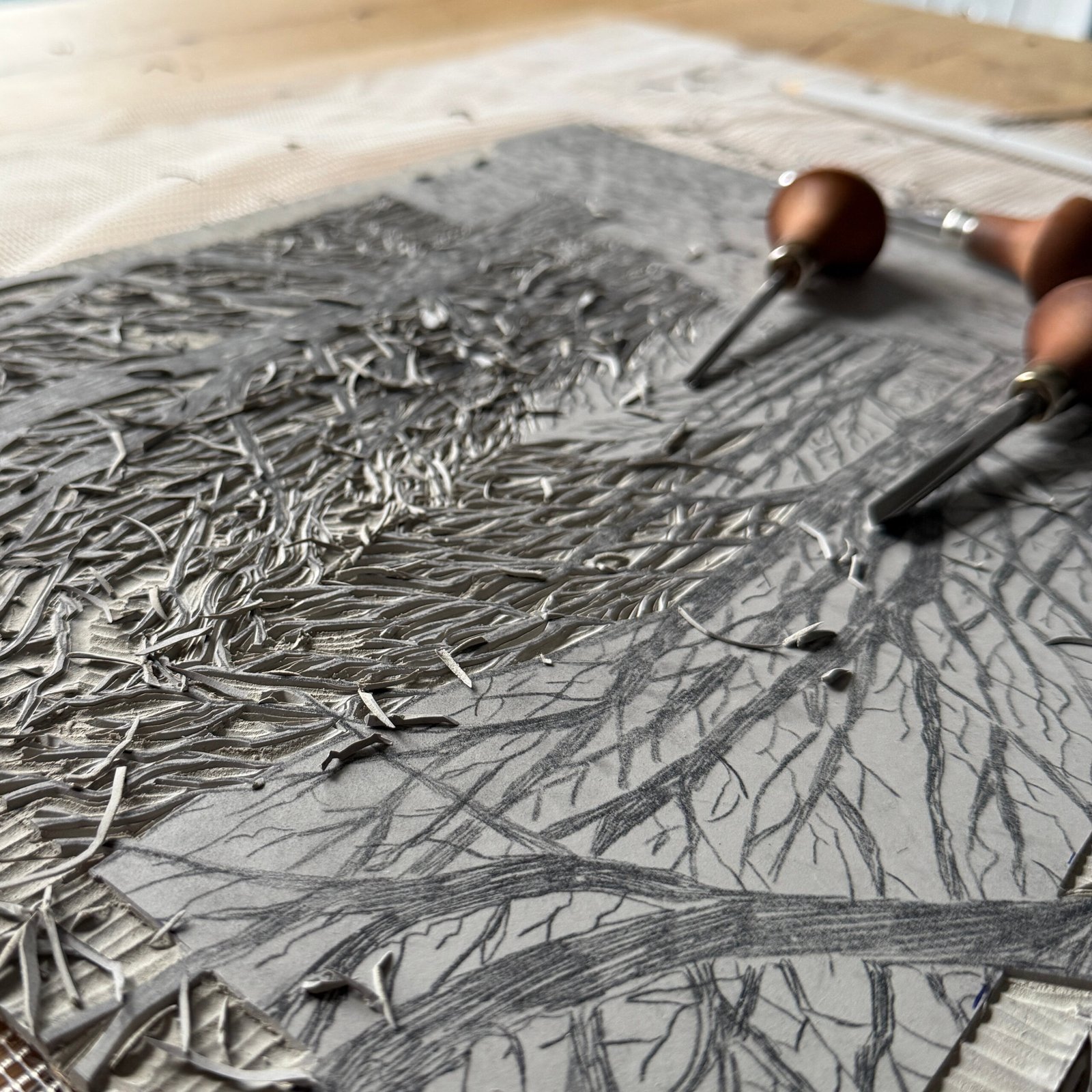 The design is carved by hand into linoleum using Pfeil gouges, always kept sharp. It’s a slow, careful process that shapes the image step by step.